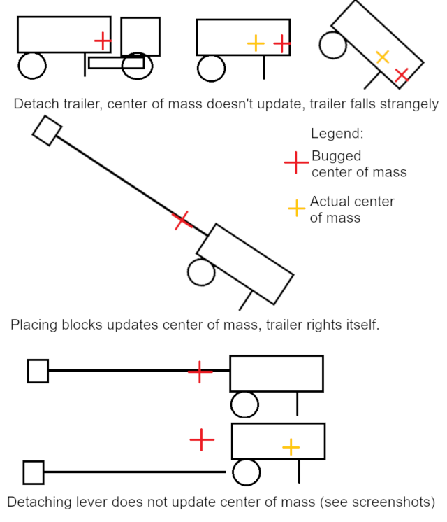 My truck trailer was detached and fell forward on its face since the center of mass was improperly set in front of the trailer piston (I believe other people have reported incorrect center of mass positions when merging/connecting, which was likely the cause). To upright the trailer, I made a long lever on the back side of the trailer, put a drill on the end, and filled it with stone. This worked, but removing the drill left the center of mass in the wrong place (see visual diagram below).