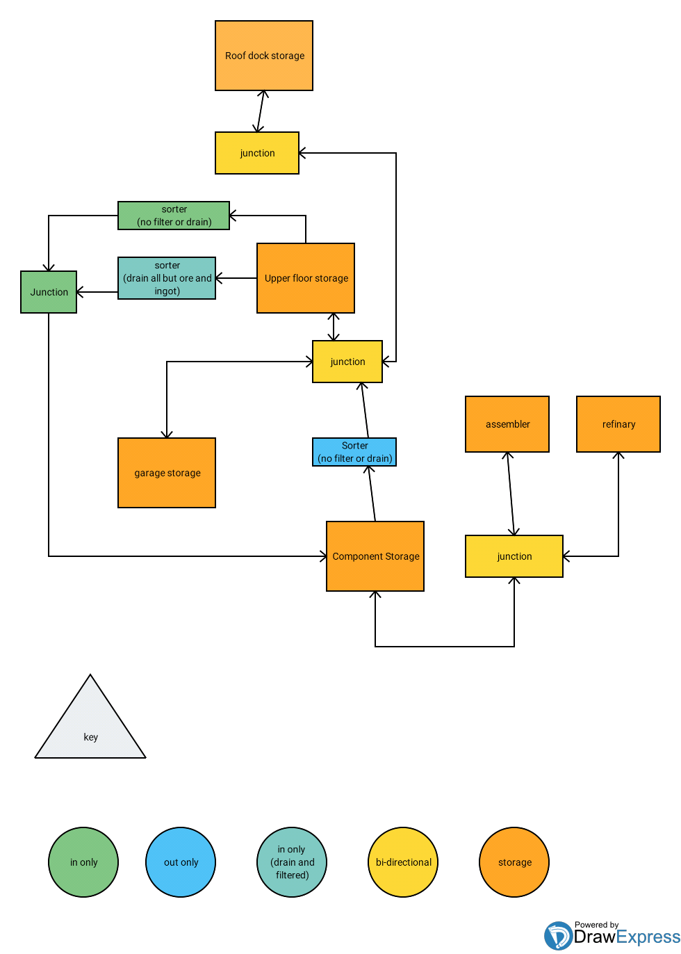 - I've color coded each box to help make it easier to see which direction items can flow within the system, there is a key at the bottom.