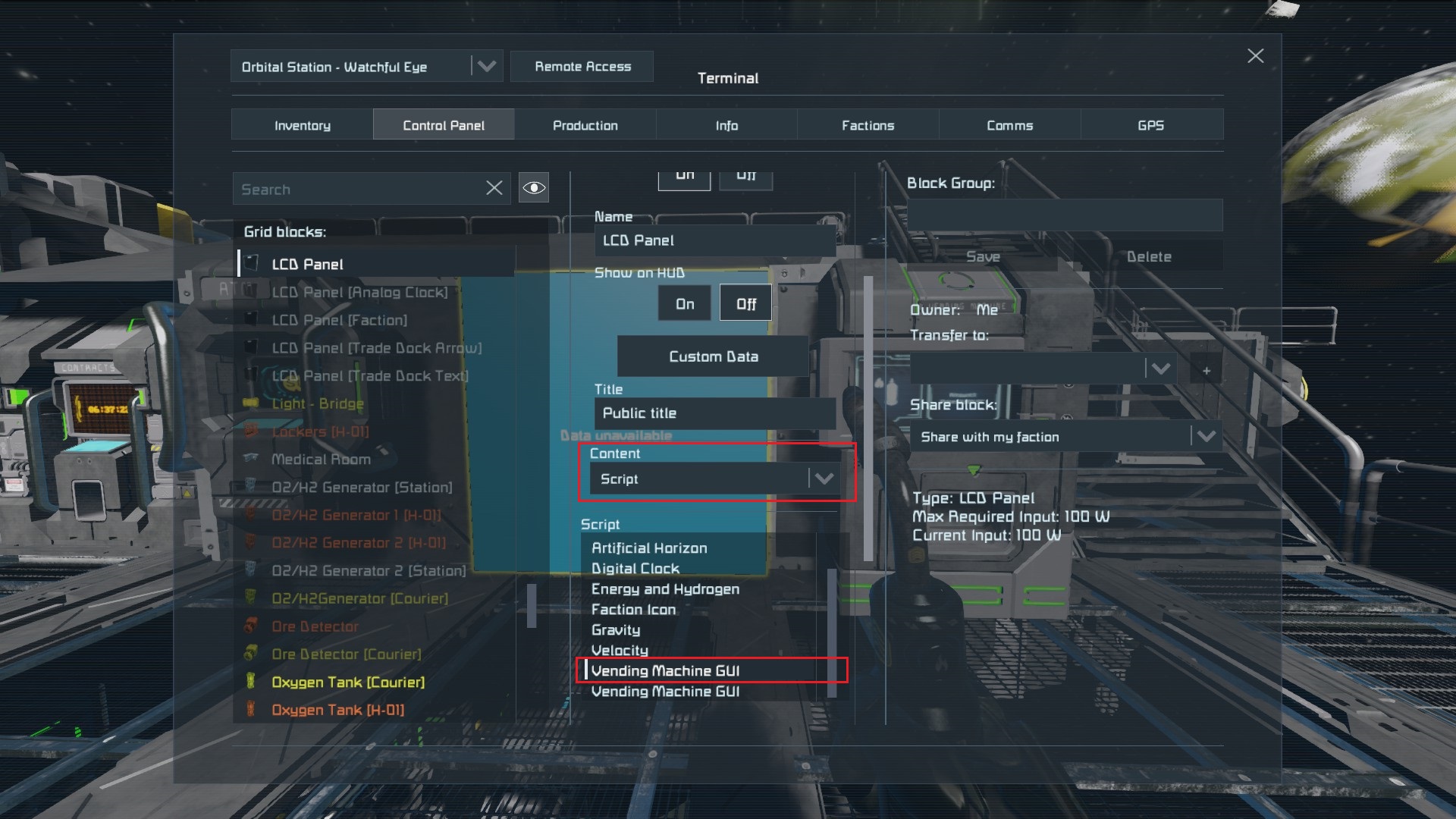 - Change LCD settings to: Content>>Script and select the "Vending Machine GUI" script