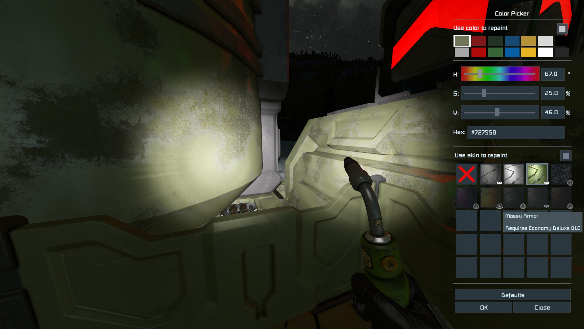 Can confirm that in the colour picker in game, hovering over the mossy or wood armor reports that it requires the economy deluxe DLC, even though they are both still in my steam inventory.