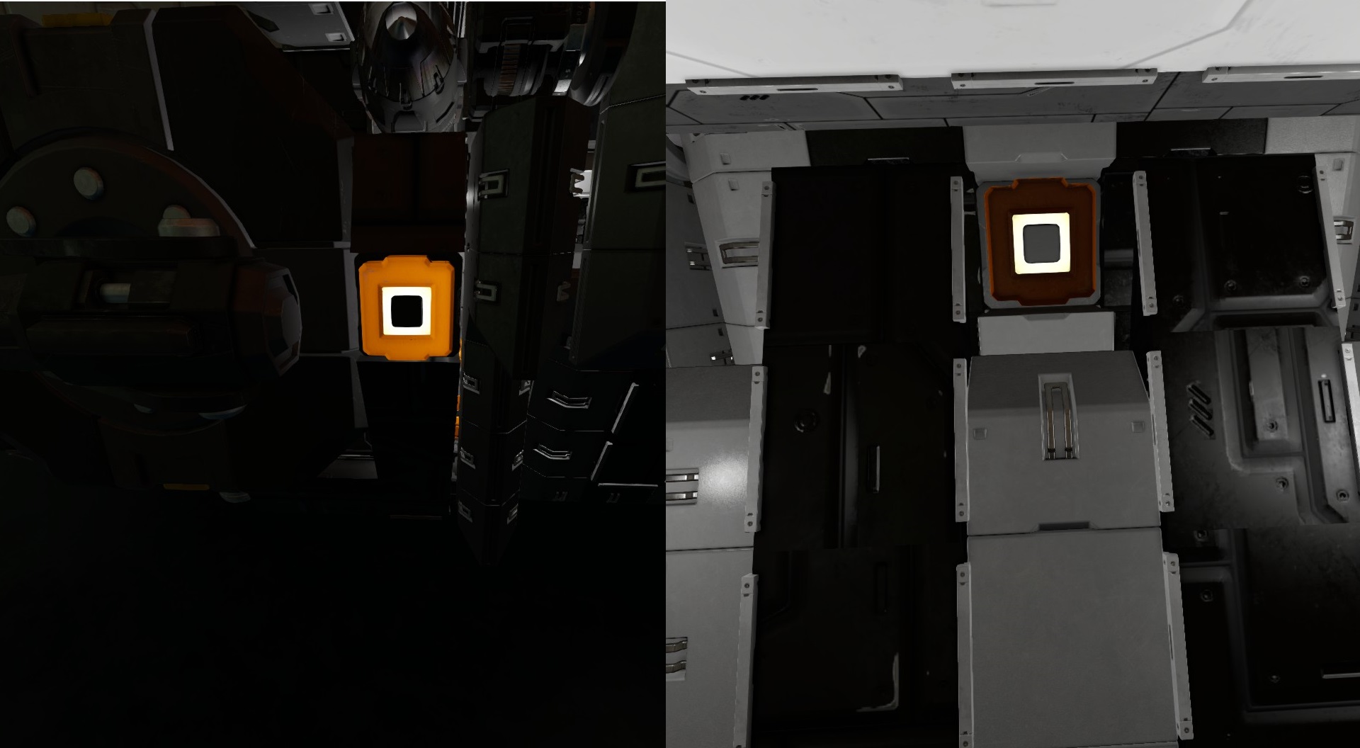 Both buttons in the picture are the exact same color, yet the one inside the ship that gets illuminated by the lights is dark, while the one on the outside is brightly lit.