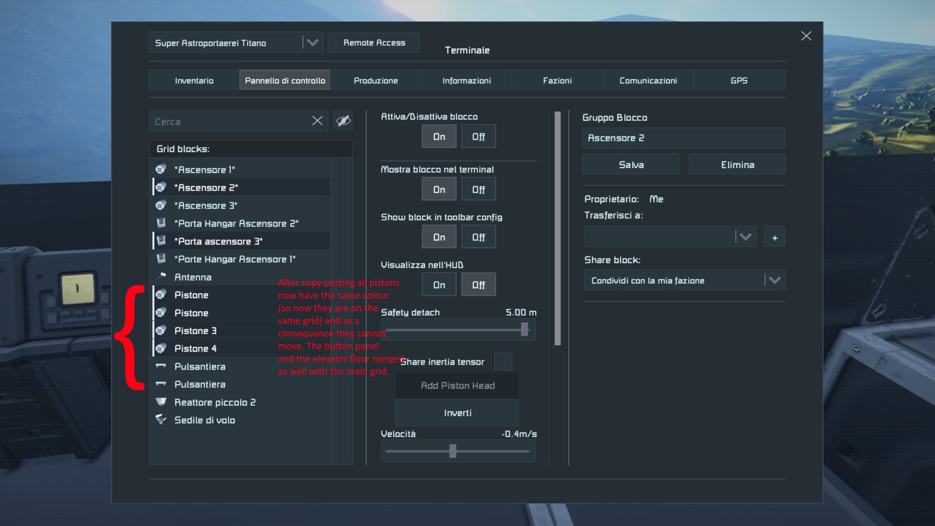 When I copy (CTRL+C) and paste (CTRL+V) the main grid somewhere else (even near the original grid) the real problem shows up. As you can see from image 007, the piston and the elevator floor are now on a single grid. This means, of course, that they can no longer move. This problem happens no matter the piston state prior to the copy, except if they are misaligned.