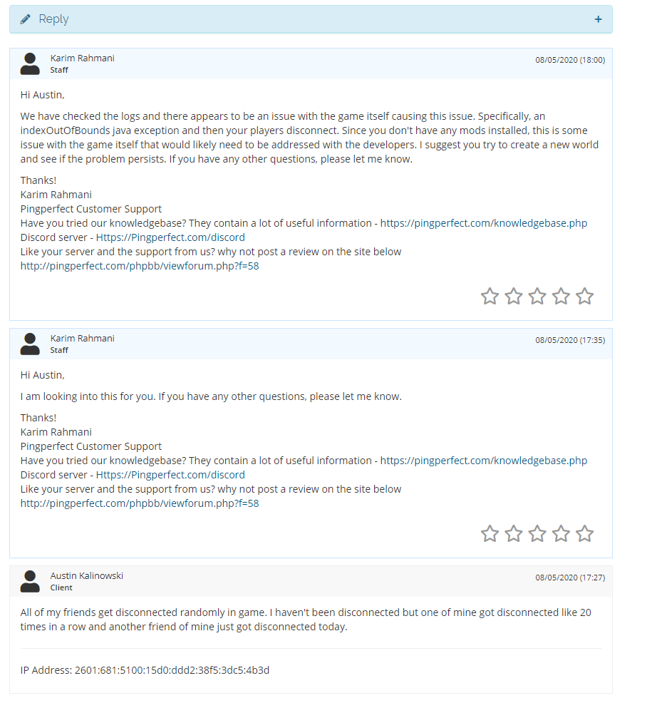 My friends get disconnected all the time. Booted for doing random things. Here is my contact with my dedicated server support. They said the issue is related to an indexOutofBounds javascript. I was hoping this issue could get fixed.