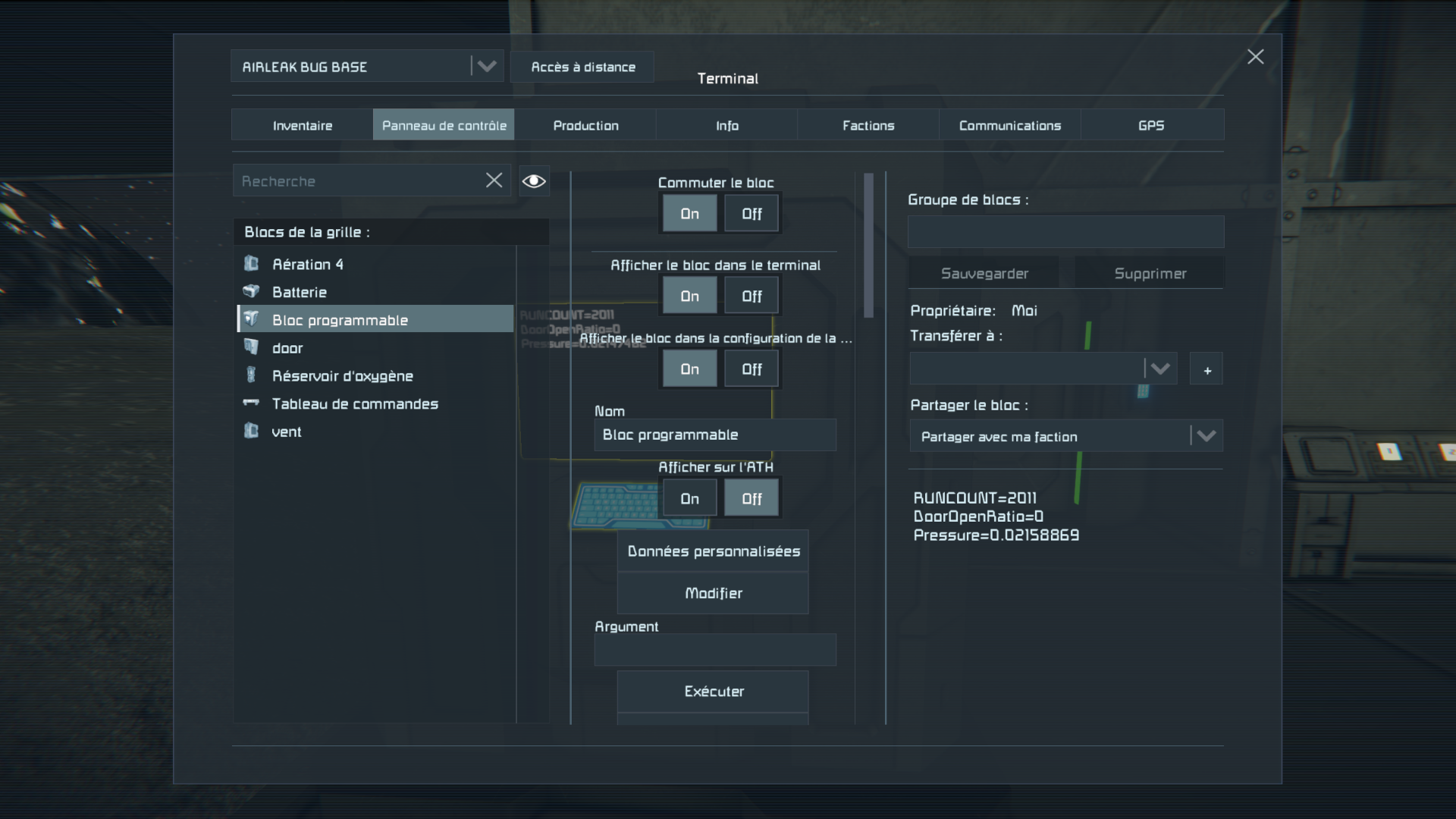 int runCount = 0; int timer = -1; // Starts messing at 3. Not sure of actual max value int maxTimer = 3; bool running = false; public Program() { Runtime.UpdateFrequency = UpdateFrequency.Update1; } public void Save() { } private IMyTextSurface GetMySurface(int n) { IMyTextSurface mySurface = Me.GetSurface(n); mySurface.ContentType = ContentType.TEXT_AND_IMAGE; return mySurface; } private IMyTextSurface GetMyScreen() { return GetMySurface(0); } private IMyTextSurface GetMyKeyboard() { return GetMySurface(1); } private IMyTextSurface GetSurface(IMyTerminalBlock b, int i) { var p = b as IMyTextSurfaceProvider; if (p == null) return null; return p.GetSurface(i); } public void Main(string argument, UpdateType updateSource) { IMyDoor door = (IMyDoor)GridTerminalSystem.GetBlockWithName("door"); IMyAirVent vent = (IMyAirVent)GridTerminalSystem.GetBlockWithName("vent"); if(argument == "go") { running = true; } else if(argument == "stop") { running = false; } if(running) { bool doorOpen = door.OpenRatio >= 1; bool doorClosed = door.OpenRatio <= 0; if(doorClosed) { if(timer == -1) { timer = 0; } if(timer == maxTimer) { timer = -1; door.OpenDoor(); } else { timer++; } } else if(doorOpen) { if(timer == -1) { timer = 0; } if(timer == maxTimer) { timer = -1; door.CloseDoor(); } else { timer++; } } runCount++; } string status = "RUNCOUNT="+runCount+"\nDoorOpenRatio="+door.OpenRatio+"\nPressure="+(vent.GetOxygenLevel()*100); Echo(status); IMyTextSurface myScreen = GetMyScreen(); myScreen.WriteText(status); }Save (and all other files) : https://drive.google.com/drive/folders/1qR4yanmXyHJiydcMiFkbaEIKYSJZqB0G?usp=sharing