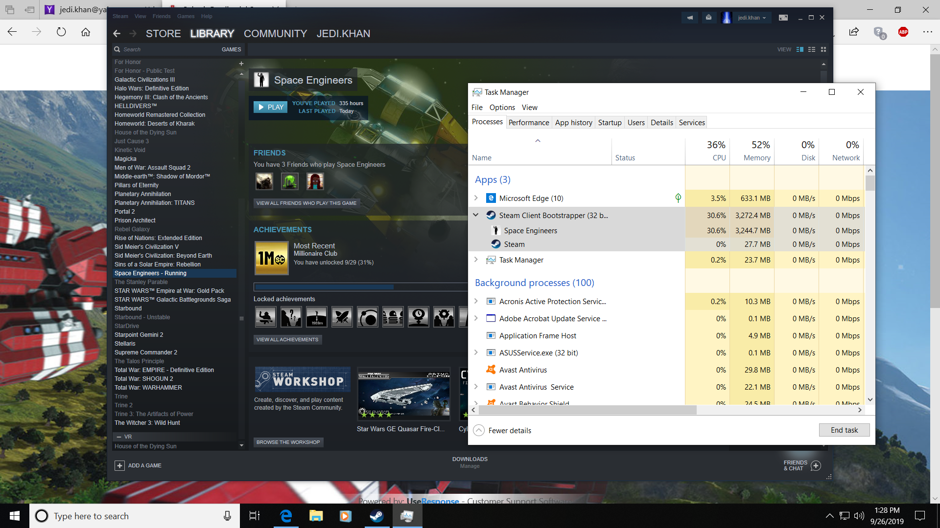 I don't know if this has anything to do with Steam itself, as no other program seems to do the same, but I've been running into an issue where the Space Engineers program (EXE file or process) does not close properly. Despite having successfully closed the program and returned to my desktop by using the in-game menu, the program remains in my active processes list in Task Manager, as well as the game showing as Running in the Steam library. It can remain like this for well over an hour after closing the game. The utilization of system resources by this zombie process does go down, but does not fully go away unless. This does not happen all the time, but has been an increasingly frequent occurrence over the last week or two.