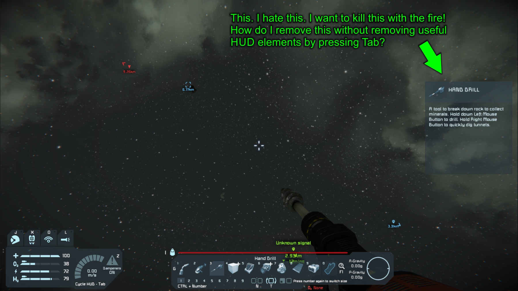 Need an option for disabling the info box over on the right side of the screen when holding a tool that doesn't involve pressing tab and disabling useful HUD information. Here is a screenshot of what I'm talking about.