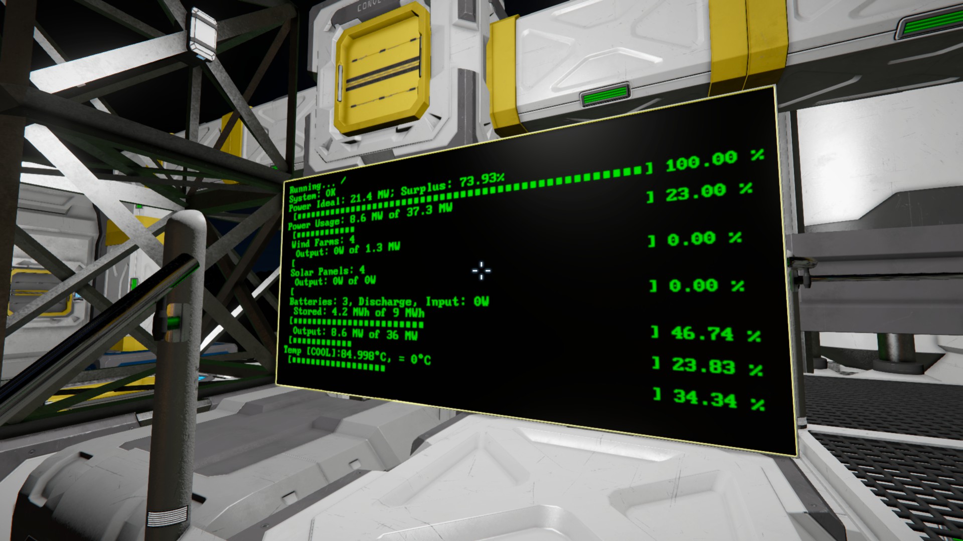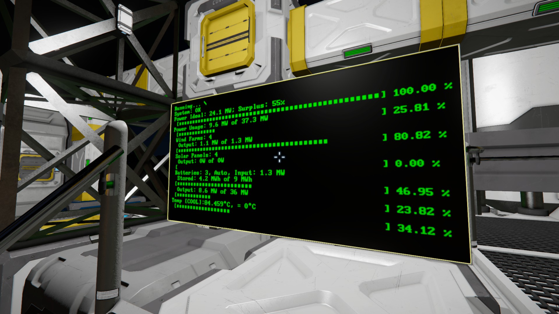 2 Screenshots showing power status, Note the line indicating Batteries Auto/Discharge, and the Wind Turbine/Farm Output