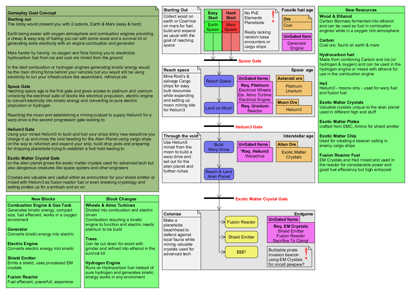 I propose a framework for the gameplay where you spawn on a planet with the goal of engineering yourself of the planet, into space and reaching the alien planet as the end goal by rewarding advanced resources for end game tech and along the way unlock content trough reaching locations bearing the required ore for building said locked content,