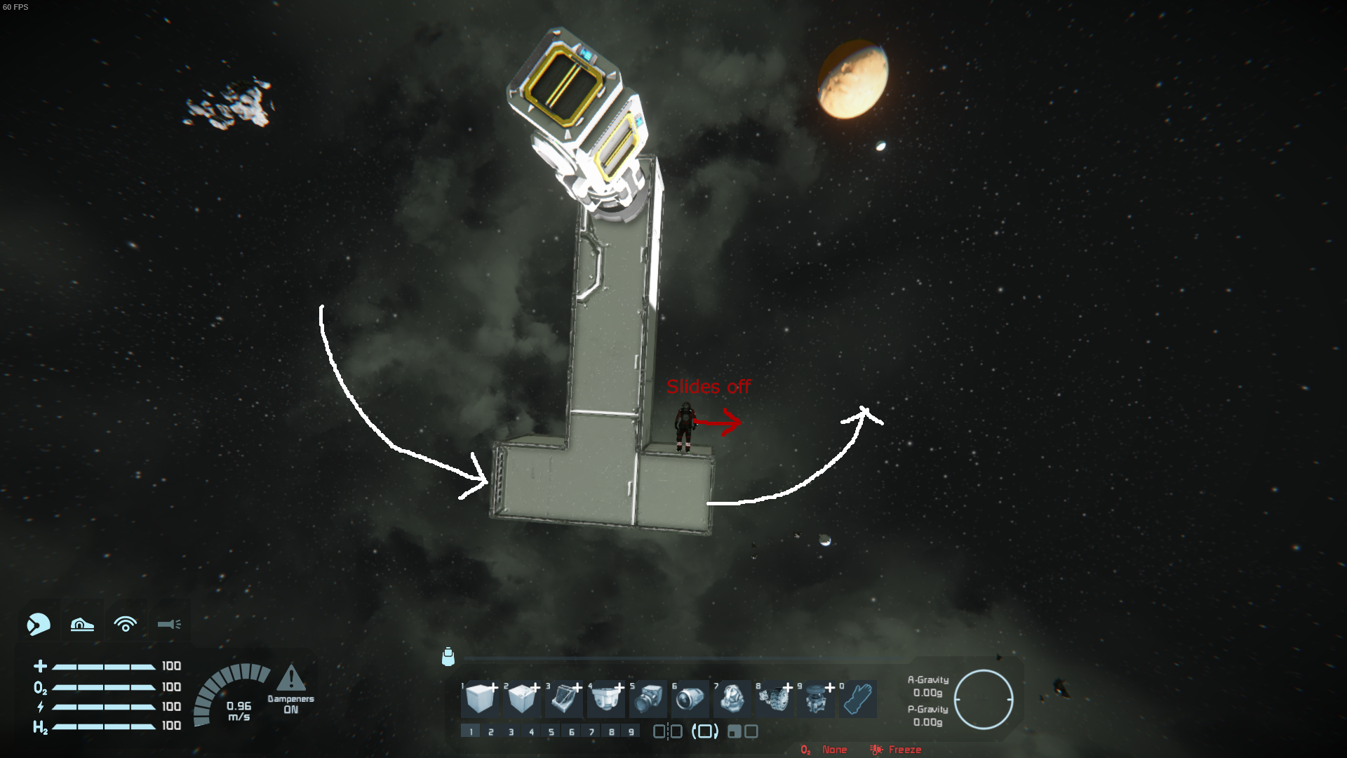 When the character is standing on a rotating grid and is not parralel to the axis of rotation it will slide. The character slides in the direction of rotation which makes rotating habitats very awkward as the character never stands still. I have attached images of the parralel and perpendicular situations.