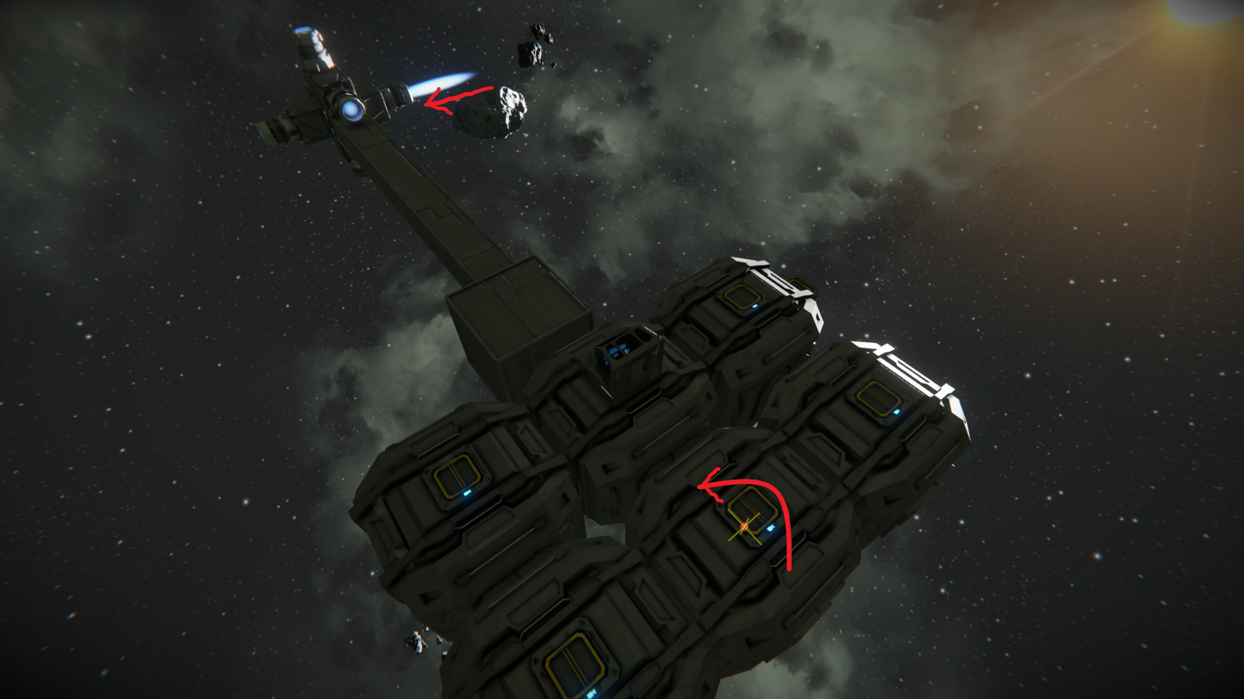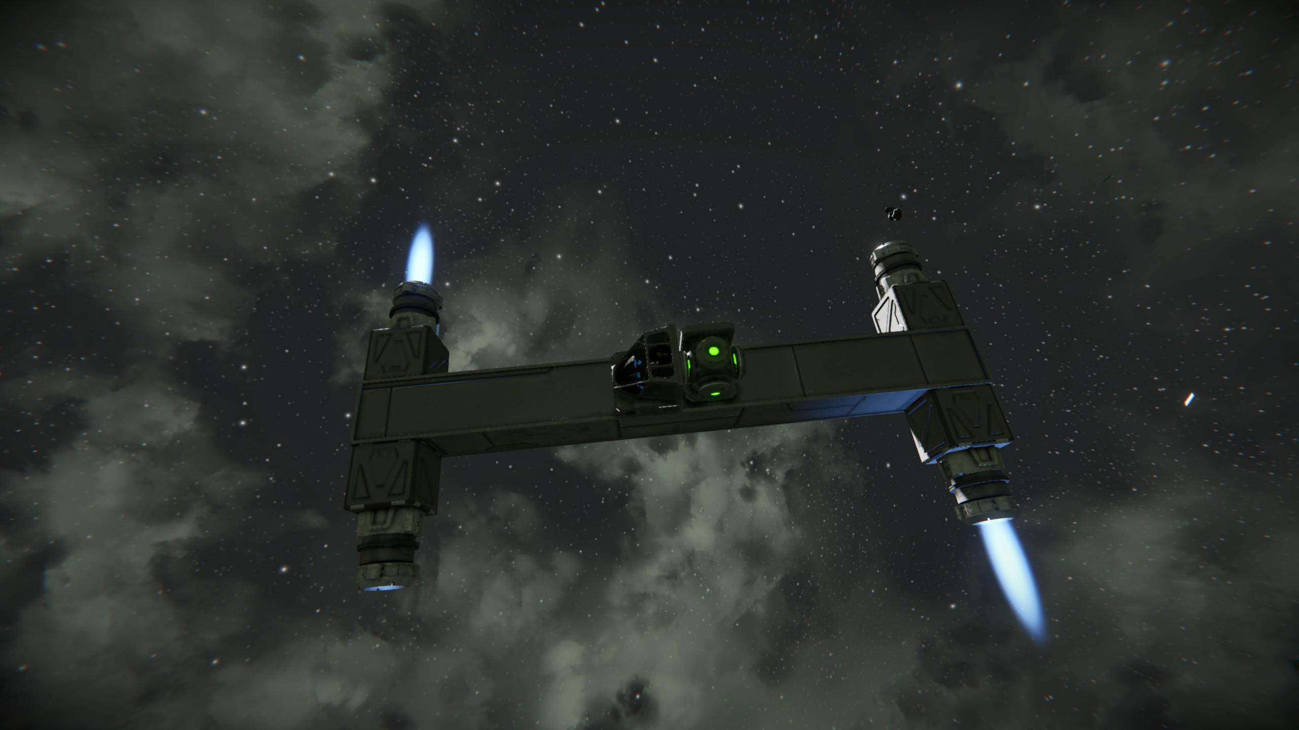 During the playtime I found out that even having ship without gyroscopes (ups) it makes them move in all directions without any problems (x,y,z). Engines were clustered in one end just to save space. It makes a bit confusing behavior, as there is no rotation applied to ship mass.