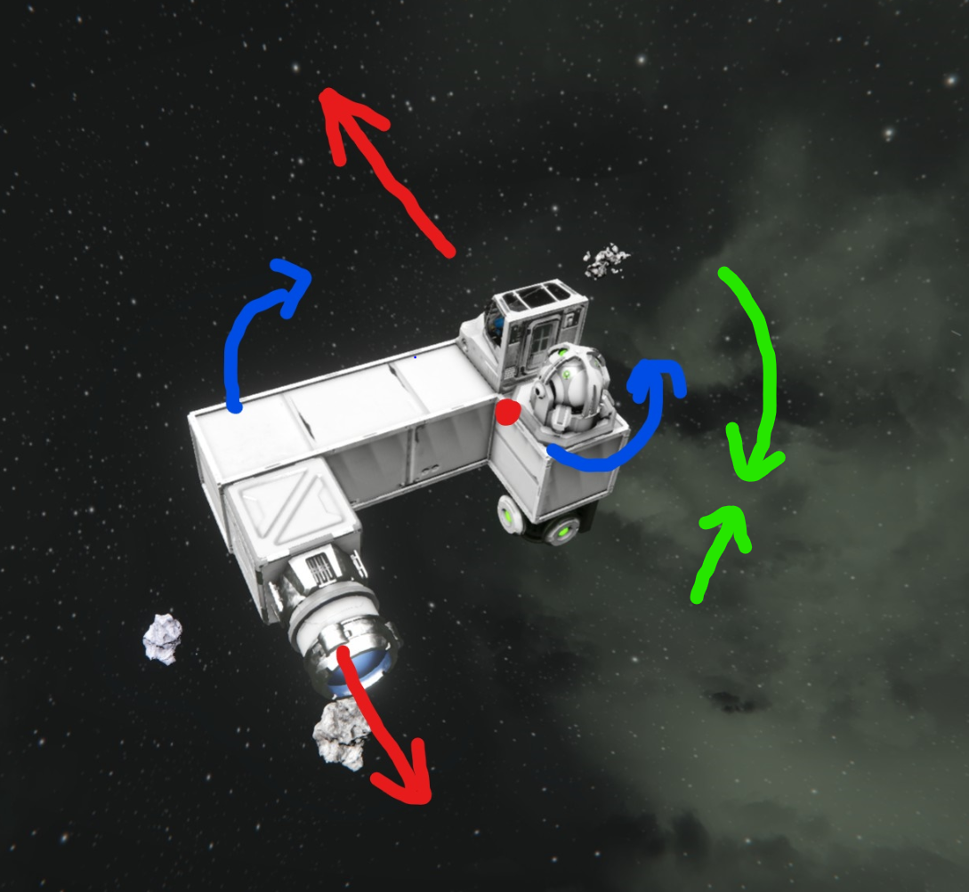 So even there author says: "Gyroscopes will help dampen the amount of torque an off-center thruster adds" And this is point. Gyroscopes in the current implementation does not work this way. They only give you fast/slow movement based on the mass of ship and amount of gyroscopes. There is no 3D space rotation vectoring.