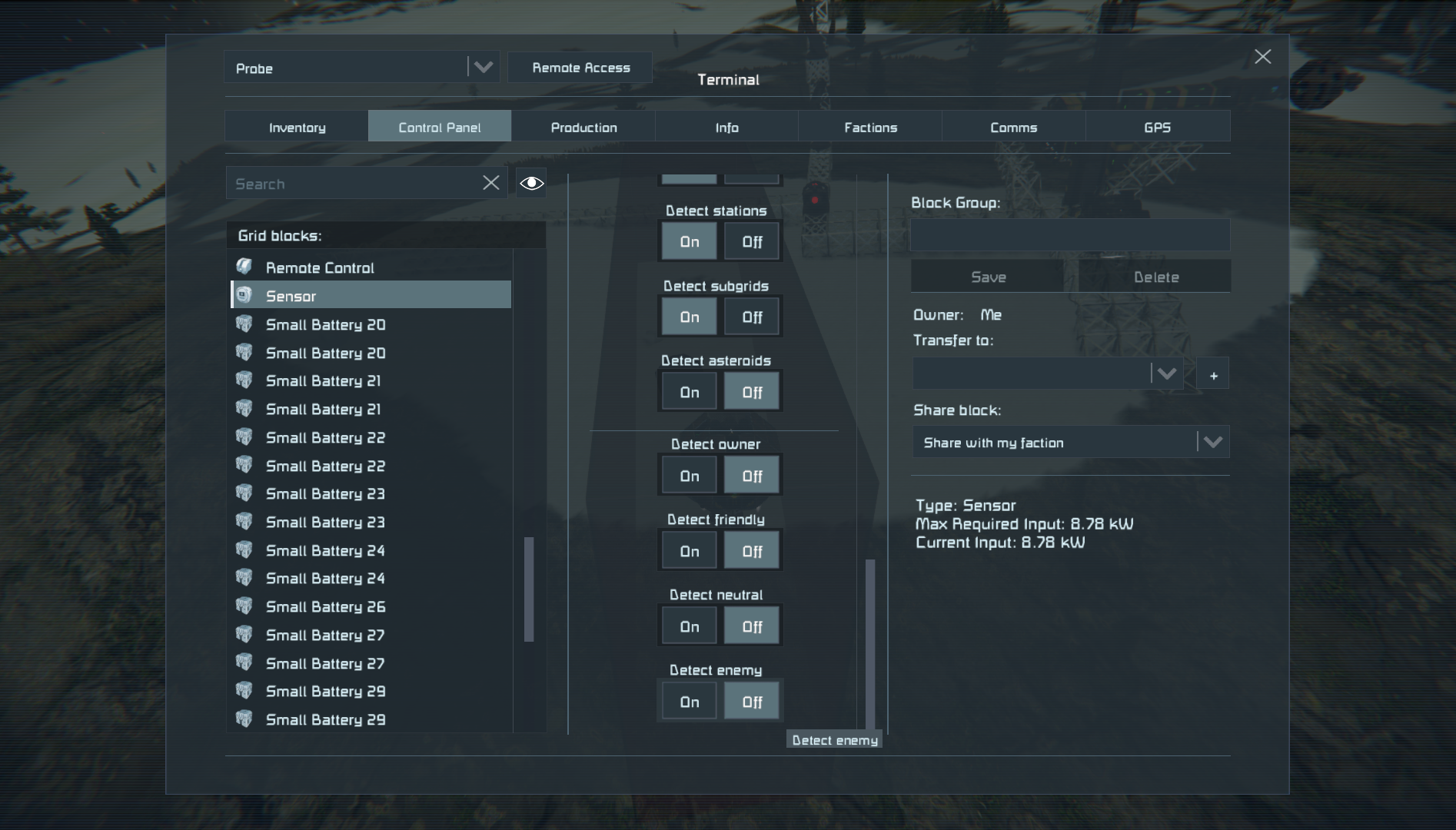 Instructions: Access the "Sensor" in front of you and turn "Detect Enemy" on. Wile "Enemy detection" is on, slide the Right extension out to detect those blocks. Now remove does blocks and check the sensor again.