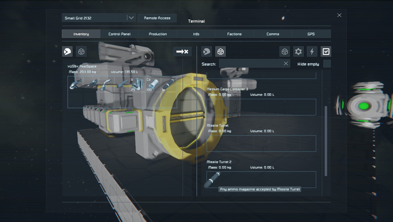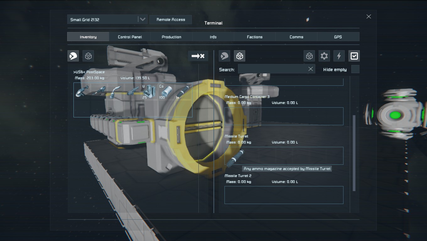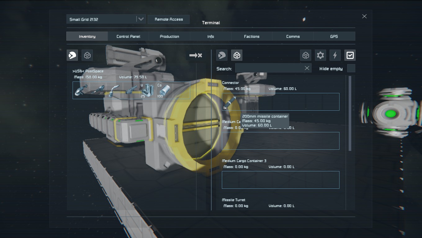 When I try to move a missile through a small conveyor system from a connector to a medium cargo container, it won't work. However, if I put it directly into the medium cargo container it will work no problem. I had a friend try it on his server and he had the same problem. I have attached multiple pictures below showing that I have tried it multiple ways to make sure that I have been doing it right.