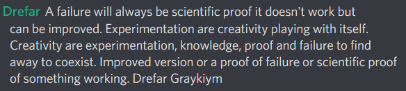 Failure will always be scientific proof it doesn't work but can be improved. Experimentation is creativity playing with itself. Creativity is experimentation, knowledge, proof and failure to find a way to coexist. Improved version or a proof of failure or scientific proof of something working. Drefar Graykiymthe capture is a clip of the original text...