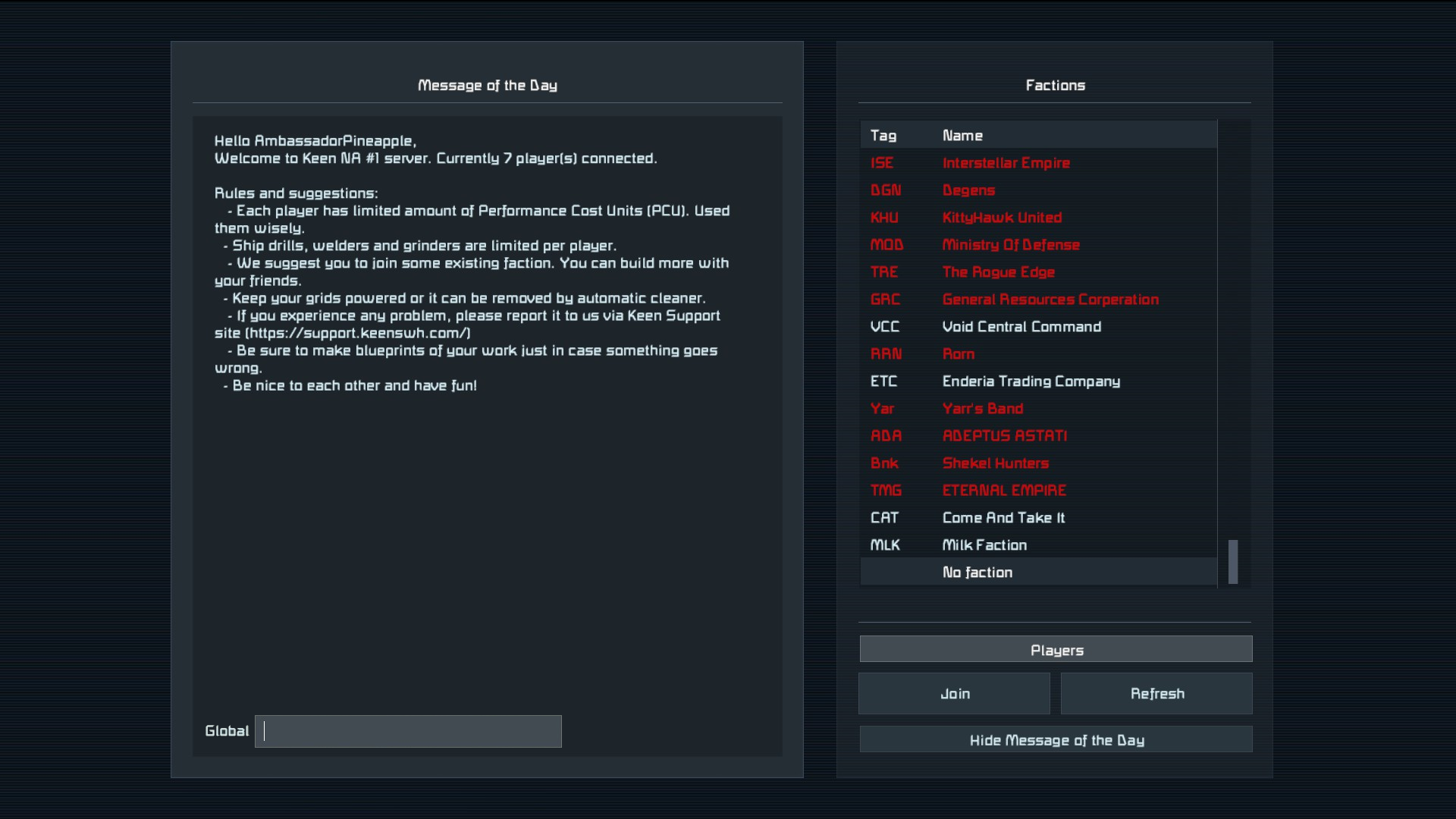 I looked, and apparently there is no way to open a chat menu to talk to everyone in the spawn menu. It would be handy to not have to spawn in a space suit every time I wanted to try asking to join an existing faction.