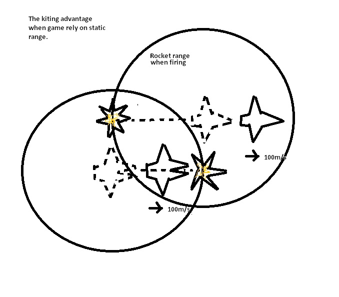 To fix the Kiting maneuver the game must increase & decrease the range of weapons depending on the direction and the movement speed of the ship. This simply meant of offseting the "range circle" of weapons to some distance away in front of the ship whenever the ship moves.