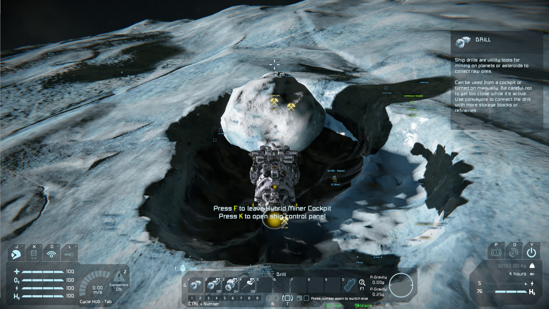 D) After a while of hand drilling, i was able to drill with ship, but only some parts. It felt like there were two layers of materials (Ice, Uranium) - which one, iw as able tu mine fully with hand drill and with ship drill, but second one, i was able to drill only with hand drill, not ship drill. This second "half" of boulder was udner the surface.
