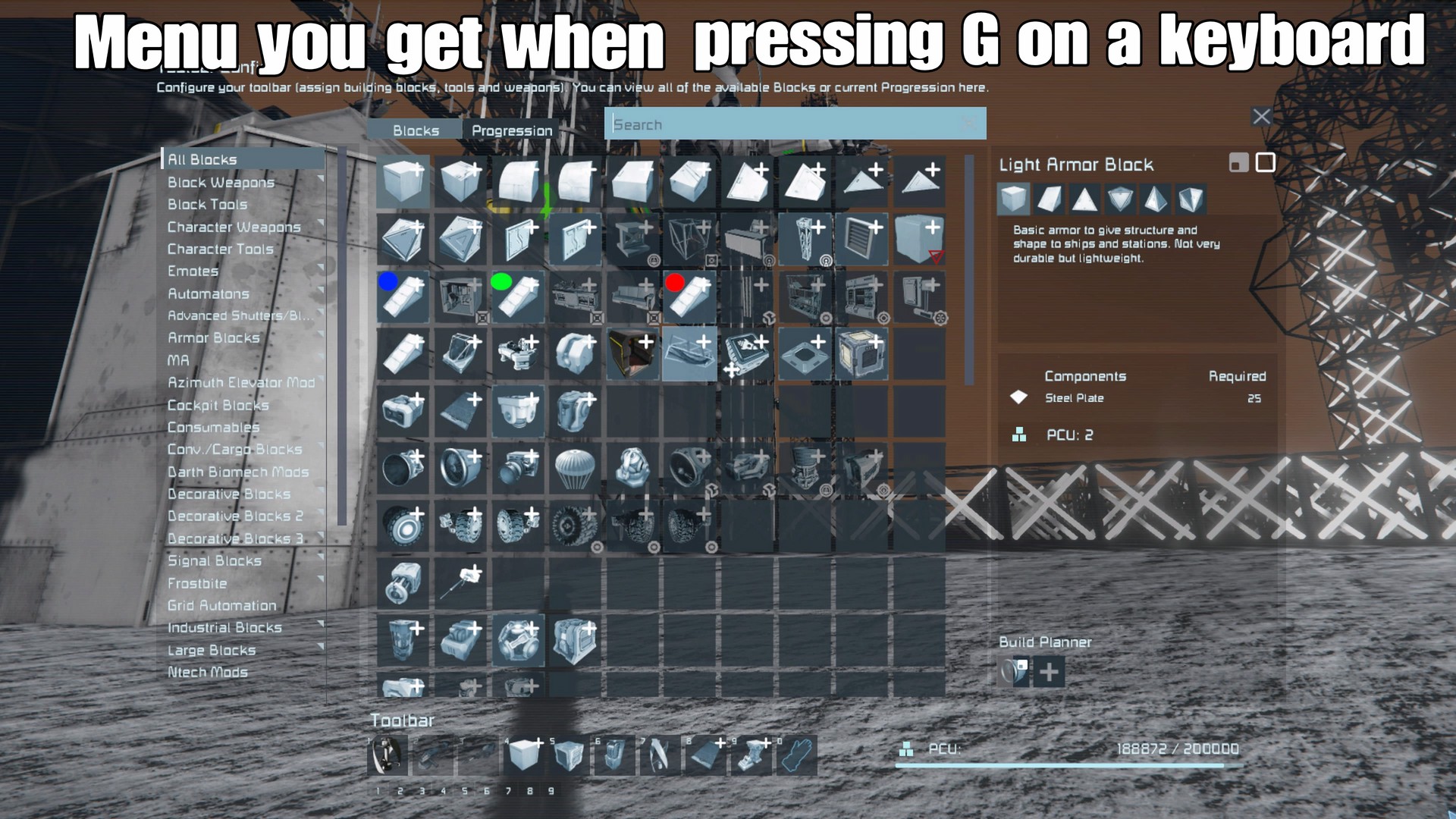 With a controller if you press L1 + left d-pad it opens up the progression tree menu, I have progression off but sometimes I need to access this menu because some blocks doesn't always appear in the building radial menu (especially frequent with modded blocks) however this menu isn't very easy to navigate searching for a specific block will cause the page to move to it but as soon as you attempt to get to that block the page jumps back to the top.