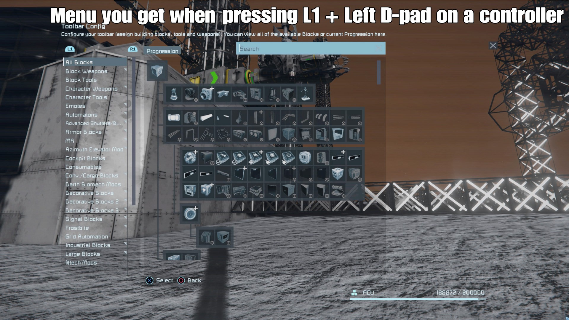 Recently I've been messing around with a keyboard and have found that if I press G it'll open a similar menu that L1 + Left d-pad gets but it's a slightly different layout, it just shows blocks but not in a tree, near the top of the page I do see a tab for progression but can't seem to switch to it with a controller (don't have a mouse). This G menu is easier to use it and it shows every block and even modded ones (sometimes modded blocks won't show in either the radial menu or the progression menu making the G menu the only way to access these blocks)