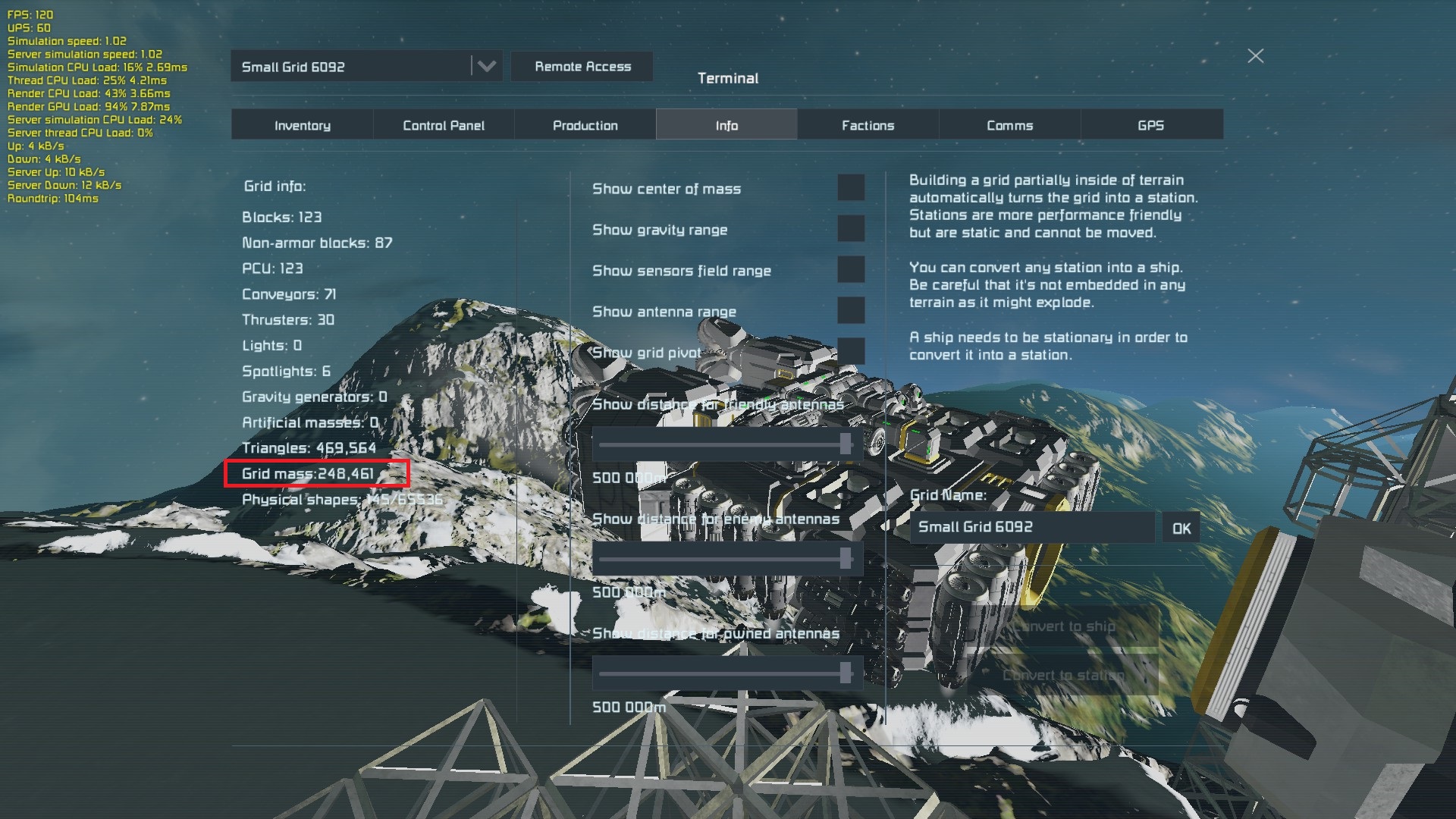 Iron ore weight on 3x Inventory size is shown as 3.000 kg but the grid mass will be 30.000 kg higher.
