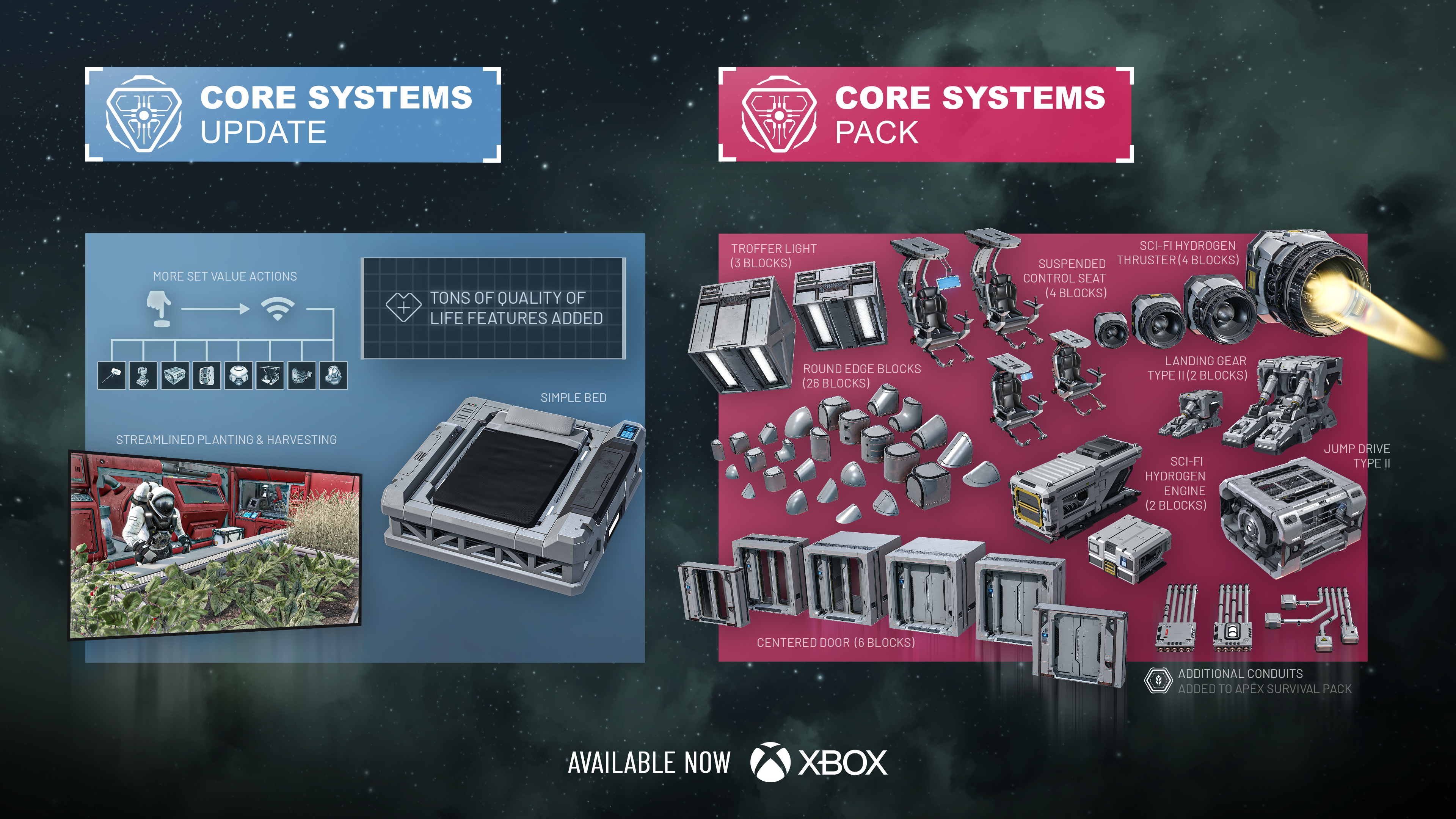 The Core Systems Update brings a wide range of quality of life improvements, gameplay refinements, and important bug fixes. This update focuses on polishing the foundation of Space Engineers - from new set value actions for multiple blocks, to joystick support, and streamlined interactions for planting and harvesting your Farm Plots.