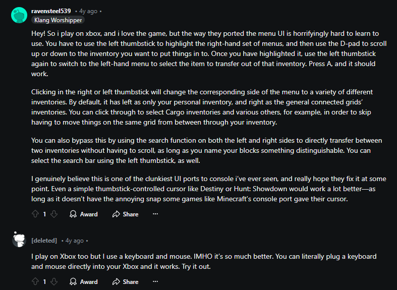 I feel the way the Xbox Radial Menu's are often times confusing and way too complex, sometimes the recent blocks don't even pop up in "recently used" until a while after. We can see from other PC ports of games like "7 Days to Die", "Kerbal Space Program", "ARK: Survival Evolved" and many others had implemented a "Cursor Mode" and kept the PC Hotbar for item selection and items were selected by using either the Bumper Buttons or the Left and Right buttons on the Directional Pad. They even have button combo's for function shortcuts just like the game has now; but the inventory management and build menu I feel is way to confusing to actually want to be like "I can't wait to build another ship." instead it's more like "Oh god, I gotta build another ship.." which isn't a bad thing especially with more complex craft but it's more that the menu itself is complex and not the other way around.
