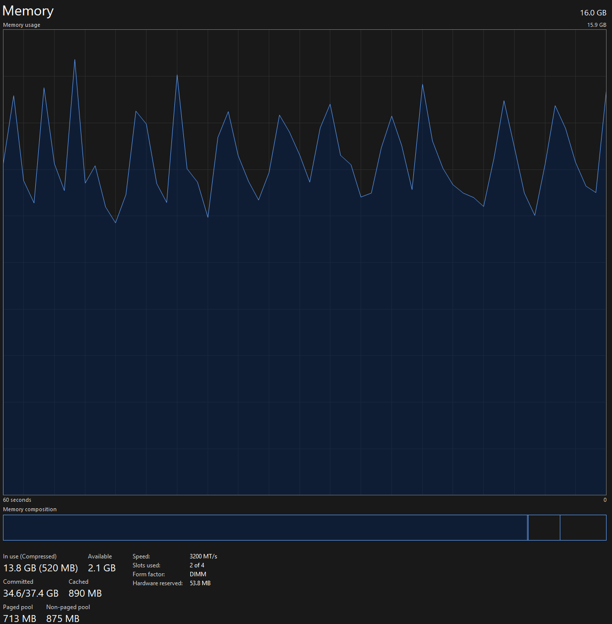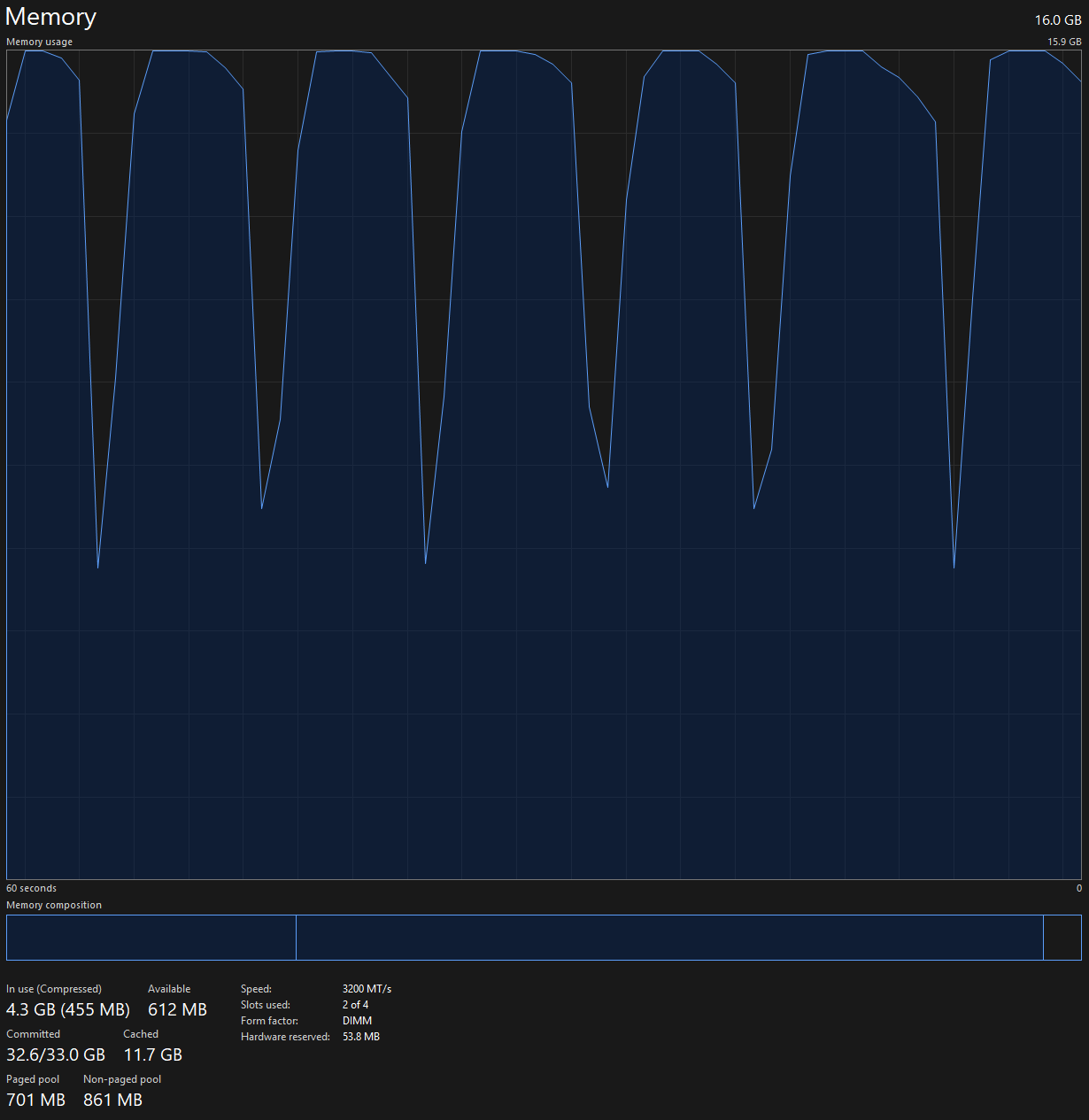 simple put play game for around 10-15 minutes and it starts having massive lag spike and when I check my ram its like this and at first its normal and flat but after 15 minutes it starts doing spikes then spikes so hard I have to reload the game and this is a joke I dont know what to do to fix this and this is the only game it happens on.