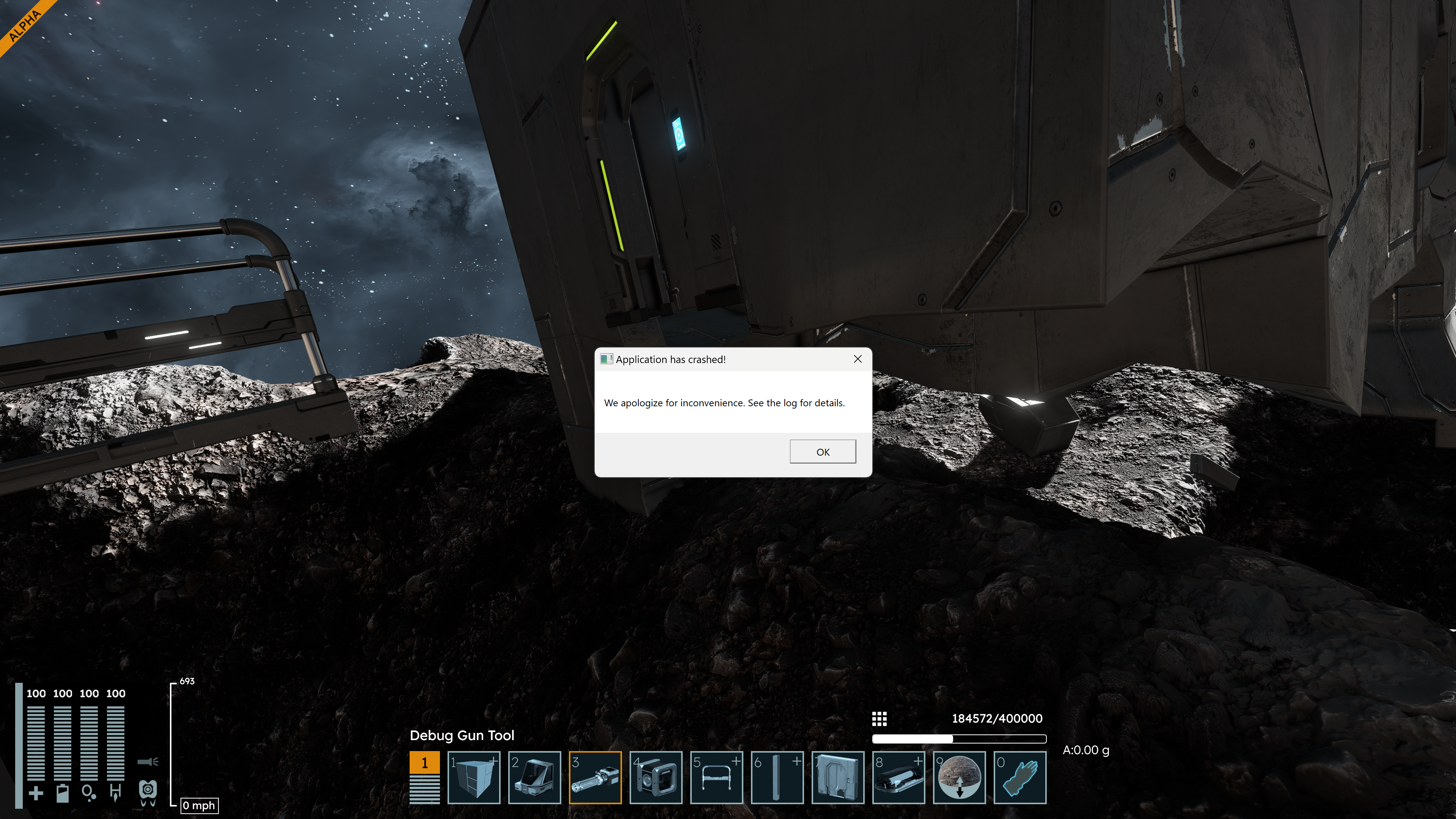 As the title says. Upon disconnecting a small surface base I built using the debug gun to destroy the grid pieces connecting it to the surface, the game crashed instantly.