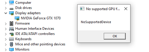it seems to correctly find the 1070 when I want to try using it... though I get a NoSupportedDevice even if it detects my 1070 as supported, whether or not I have any amount of other drivers or cards installed. check the image for reference. I have been unable to run the game, with pure nvidia drivers on a supported card, and even integrated drivers uninstalled using DDU utility in safe mode. It shouldn't get cleaner than that.