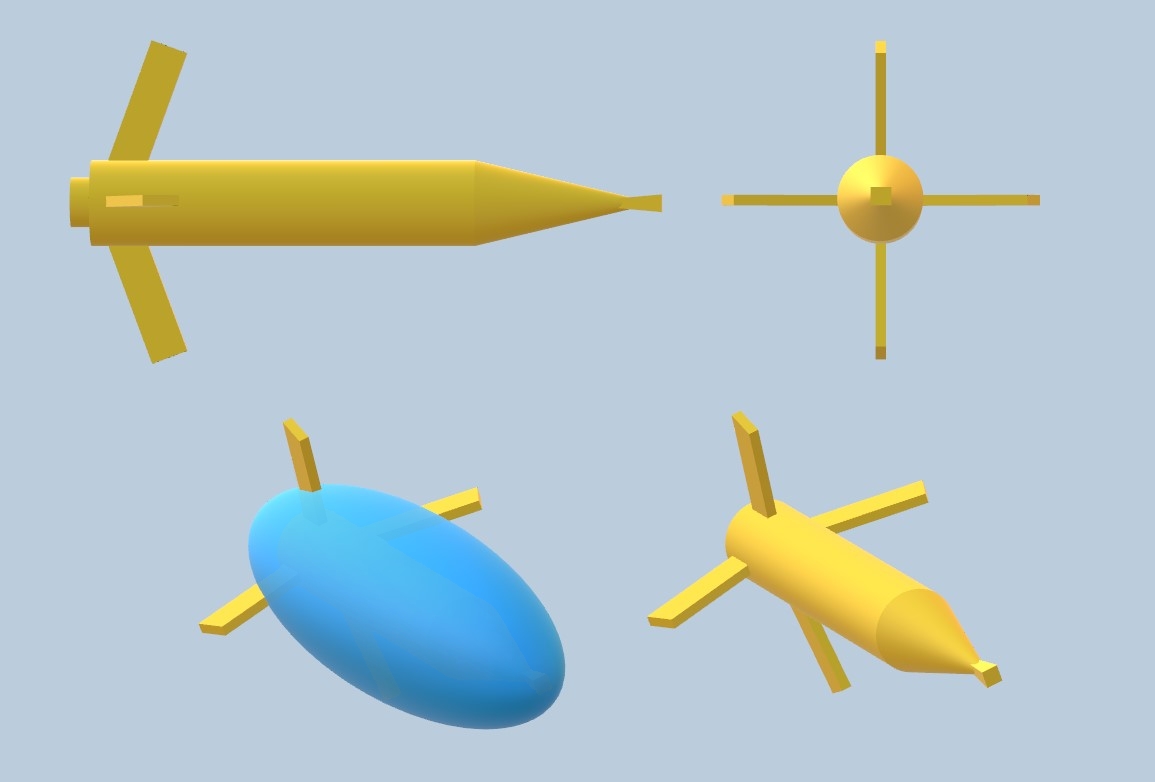It shoots a shell-rocket using compressed air. The shell-rocket has a jet engine that works for no more than one second. It has sliding stabilizers. There is a cavitation rod in the bow. After being shot with compressed air, the shell-rocket moves in a cavitation bubble, which allows it to quickly cover a large distance in water. At a certain distance, it self-detonates. Howitzer 200mm. Cumulative. (Possible optimal shell shape is a cone)