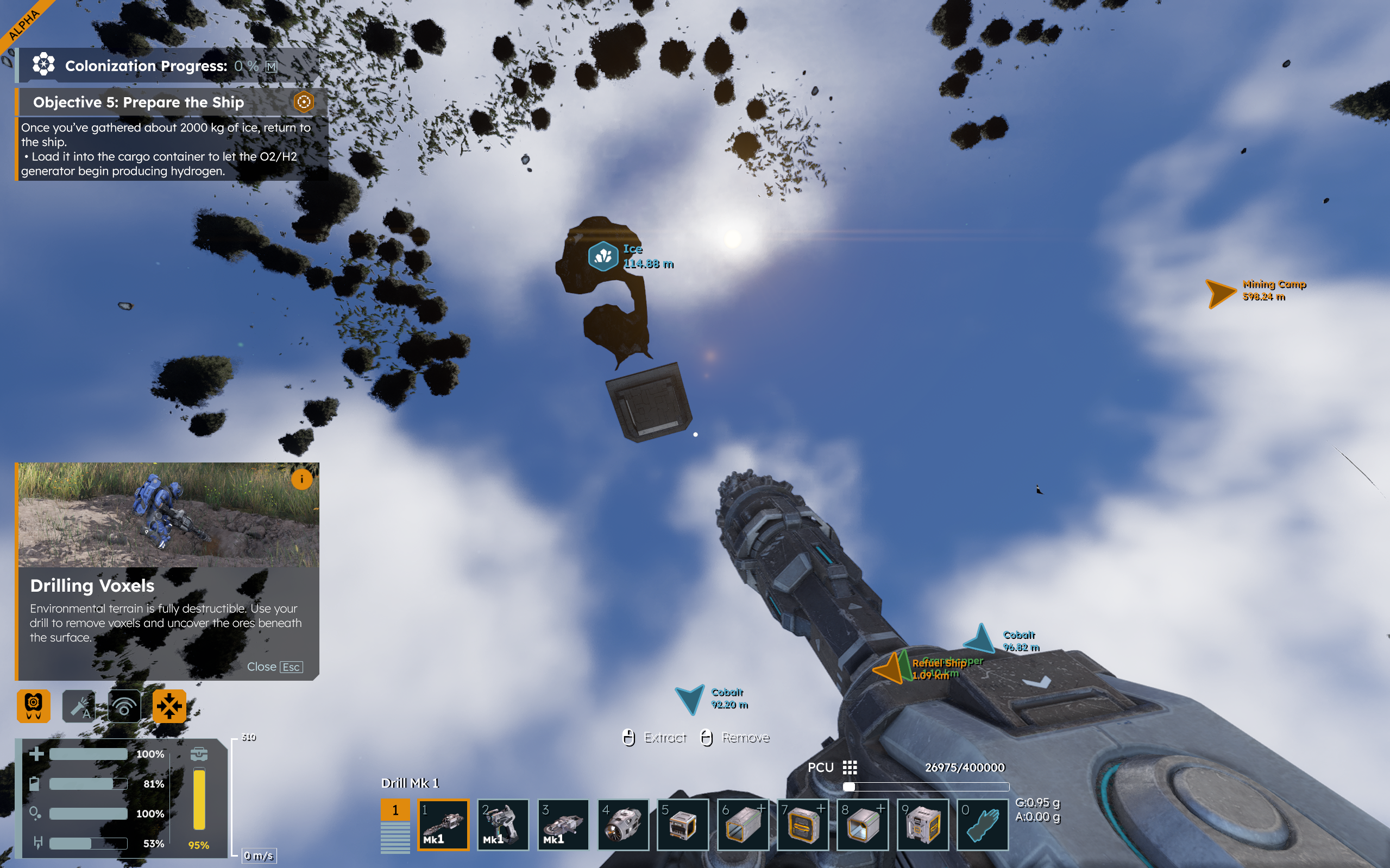 also while mining resources have fallen through the voxels on a campaign mission , with quick thinking enabled jetpack to save on fall damage and managed to drill an imaginary hole back outside , also clip through voxels on walking sometimes up to my head ship also clips through the same areas