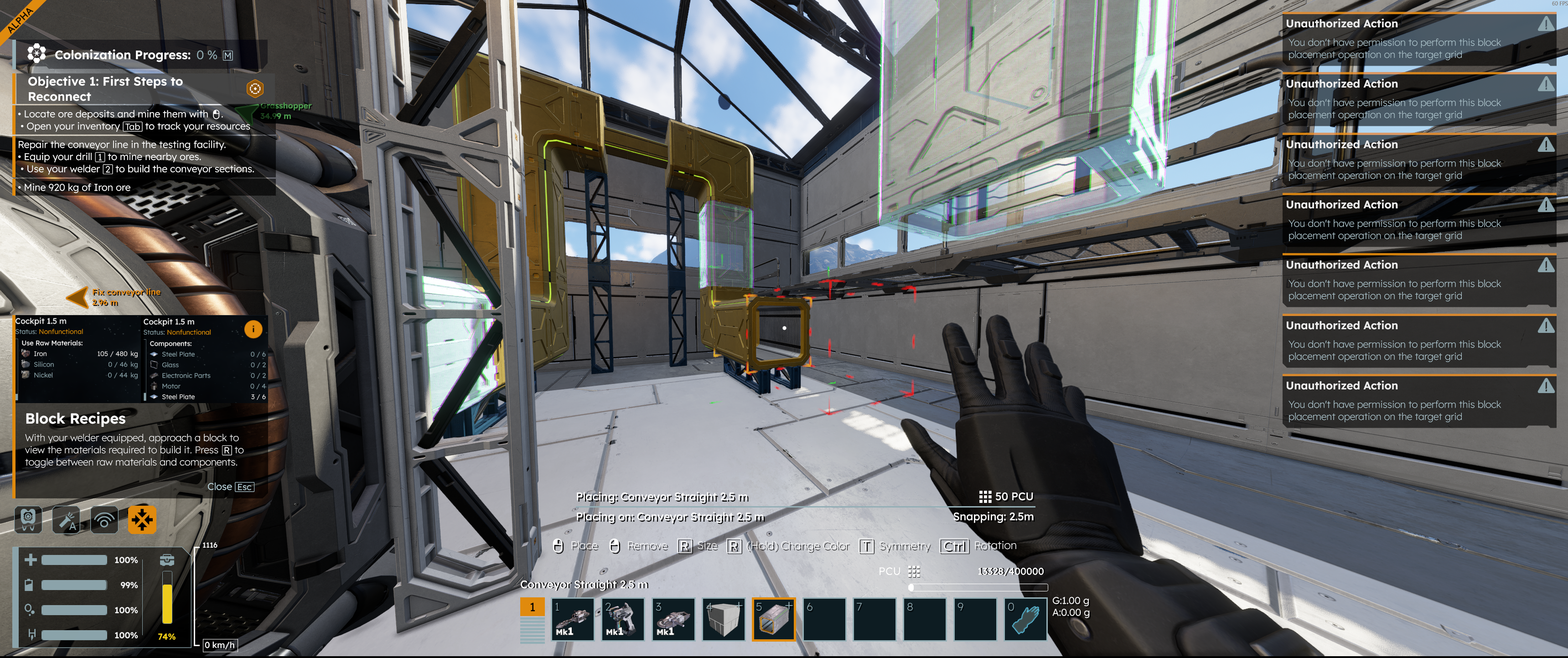 However continue building from a blueprint seems to avoid the grid permission check enabling you to attach anything you want to the grid. As shown i was able to build a conveyor out the wall and steal all the hydrogen fuel.