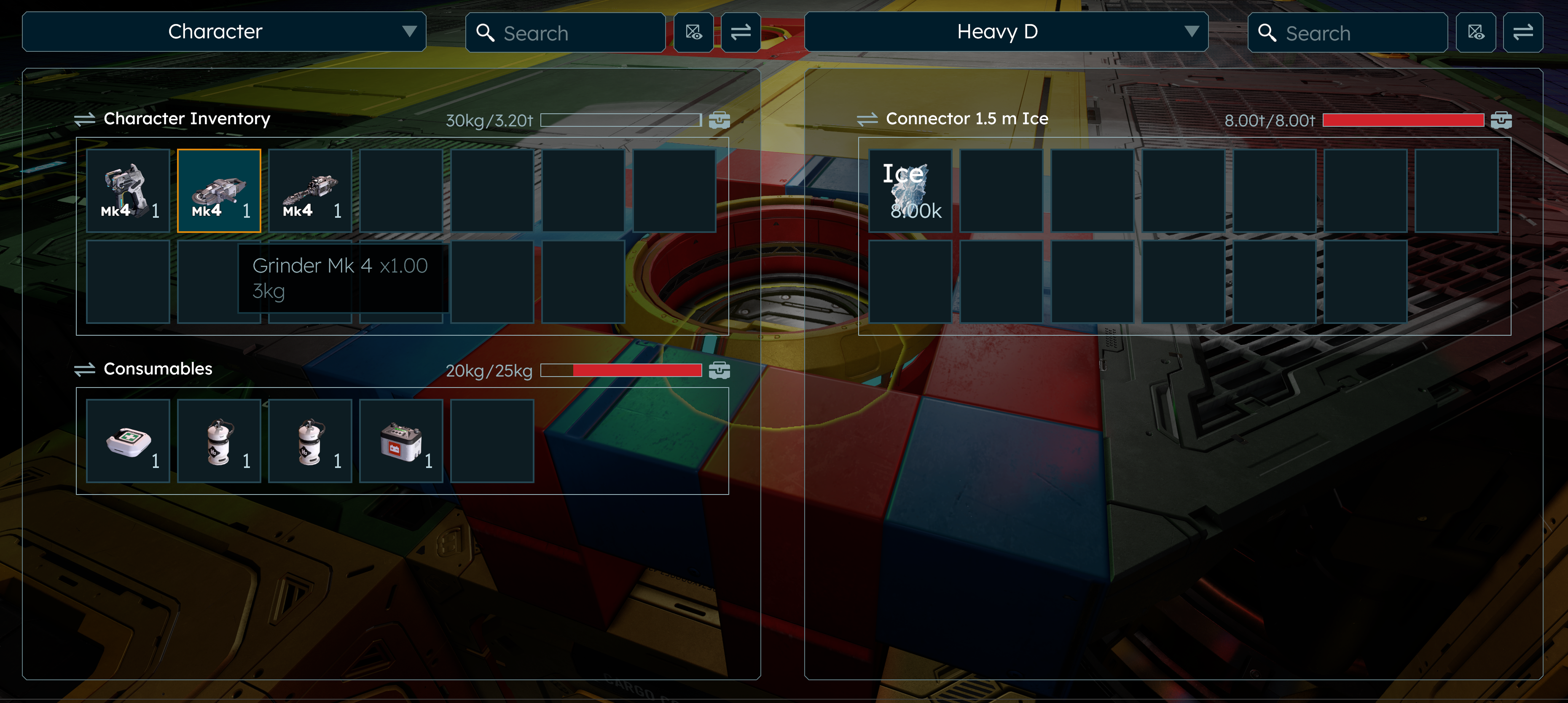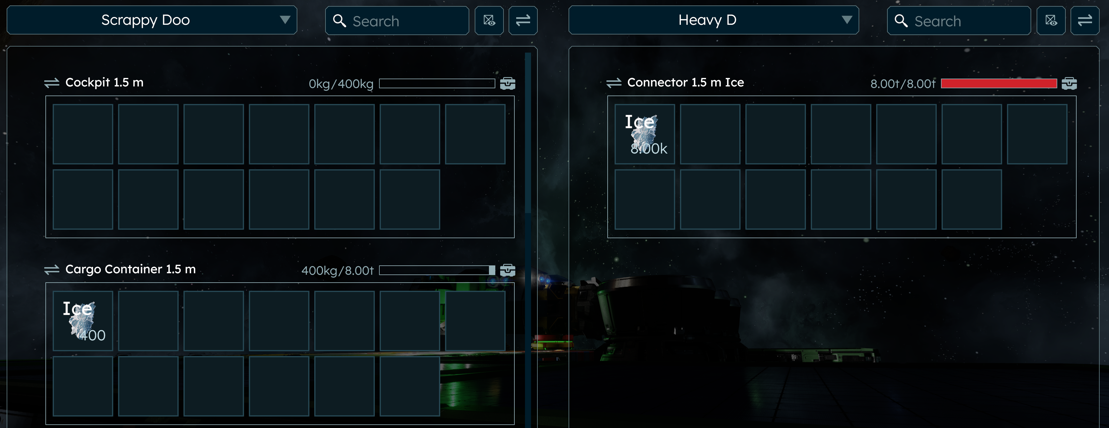 The second picture reveals the inability to transfer items into the cargo through the "Ice Connector" from the mining ship cockpit.