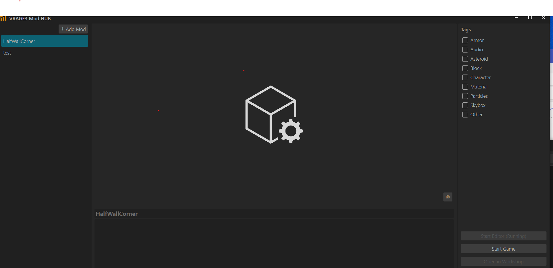 After closing the "VRage Editor.exe" the VRAGE3 Mod Hub has the "Start Editor (Running)".