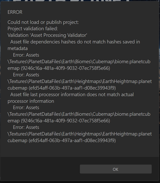 Unable to publish Planet mod due to Asset Processing Validator hash mismatch (no validation errors )