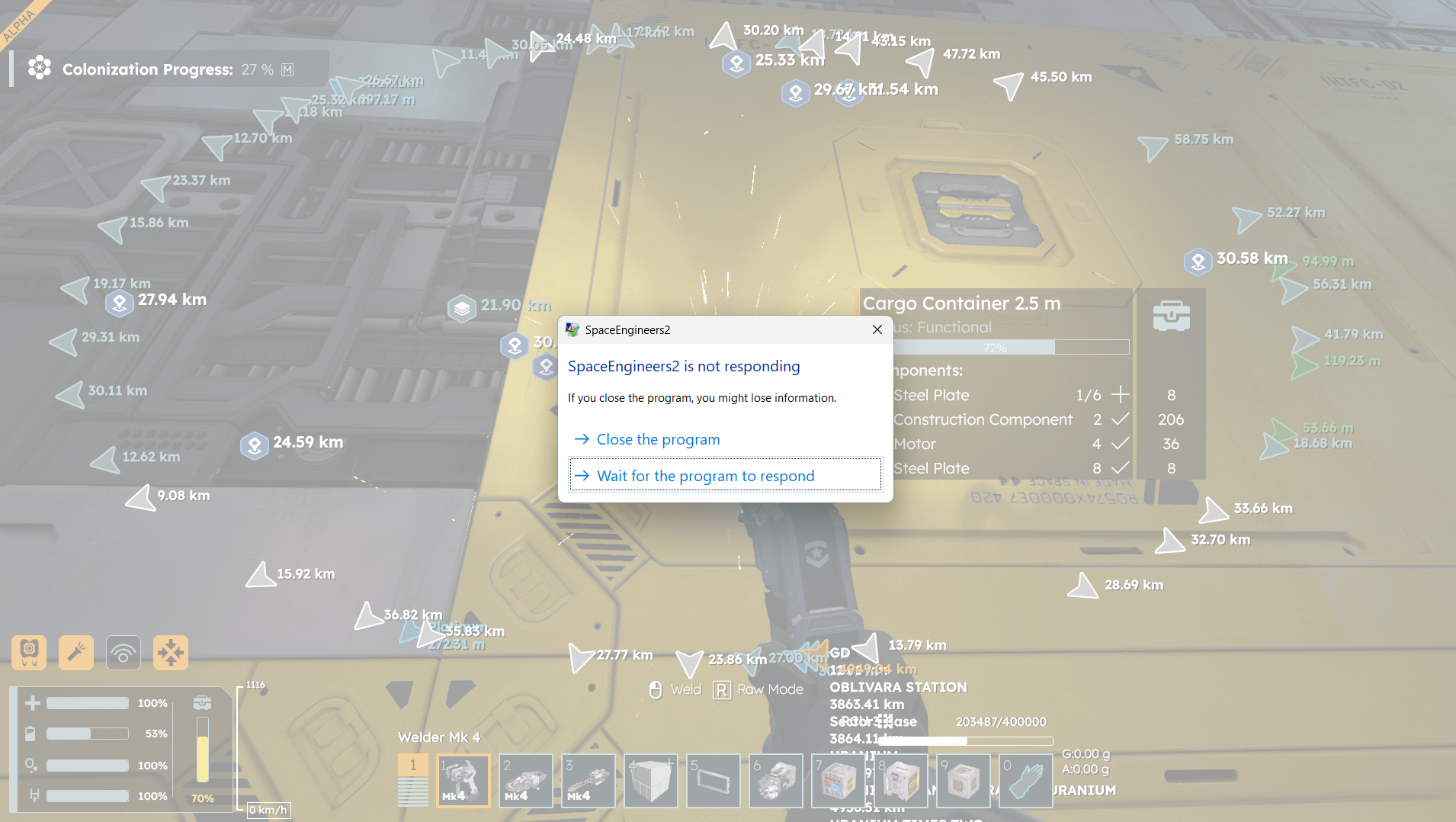It just happened again. A minute or two before the crash my character could not fly for approximately 20 seconds. Sometimes we can move for a few seconds as if the JetPack is off. We can rotate and use hand tools, but no response from jetpack. I grown up and welded several blocks and then the game froze/crashed as I was welding.