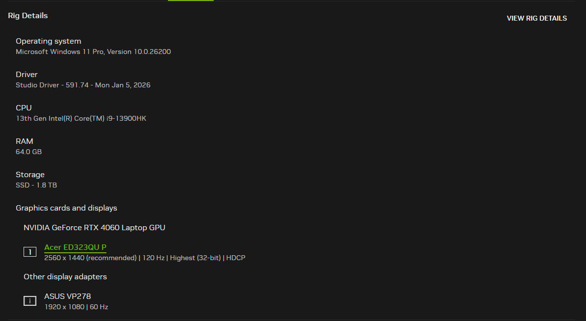 Just in case you are needing this info for my system, to show if the game can run fully supported. I have run both drivers for the Nvidia card, latest versions of both game ready and studio and this has not made any difference.