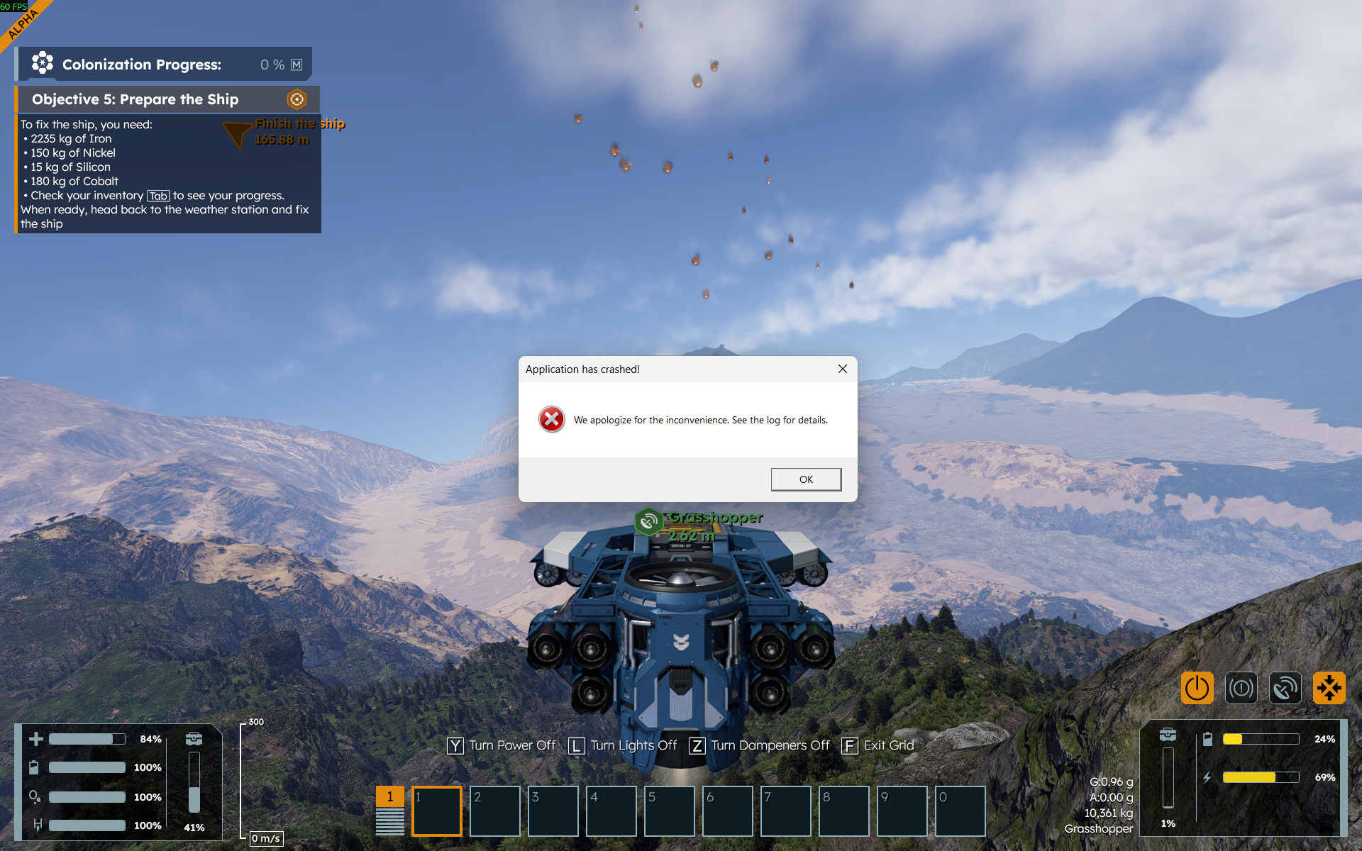 Was playing the survival intro mission, at the weather station, just returning from picking up resources to repair the hydrogen ship. A meteor storm spawned a little distance out, and when the first few impacted, the game shut down. Have reloaded multiple times from a few different recent autosaves, but the game crashes without fail whenever the first meteors impact. Game has had minimal performance issues so far, typically runs around 60 fps.