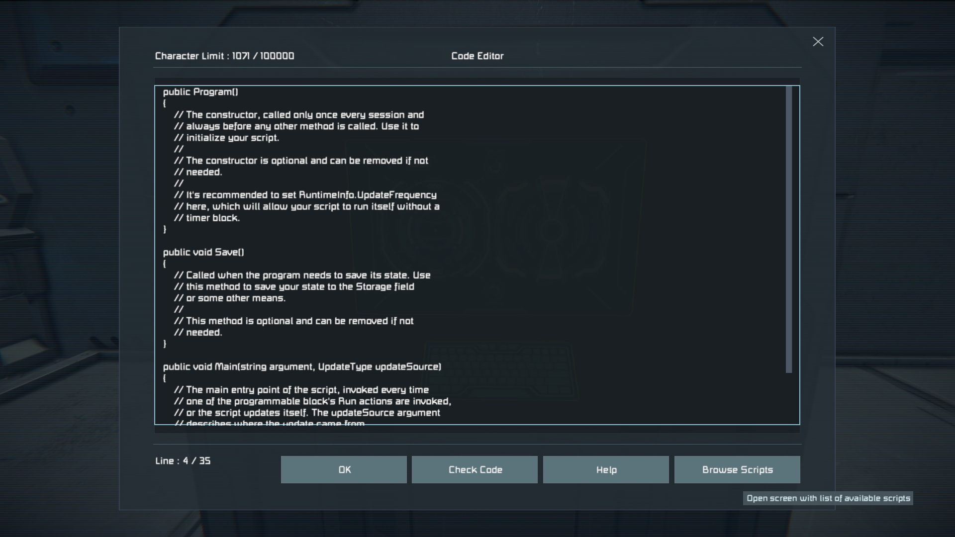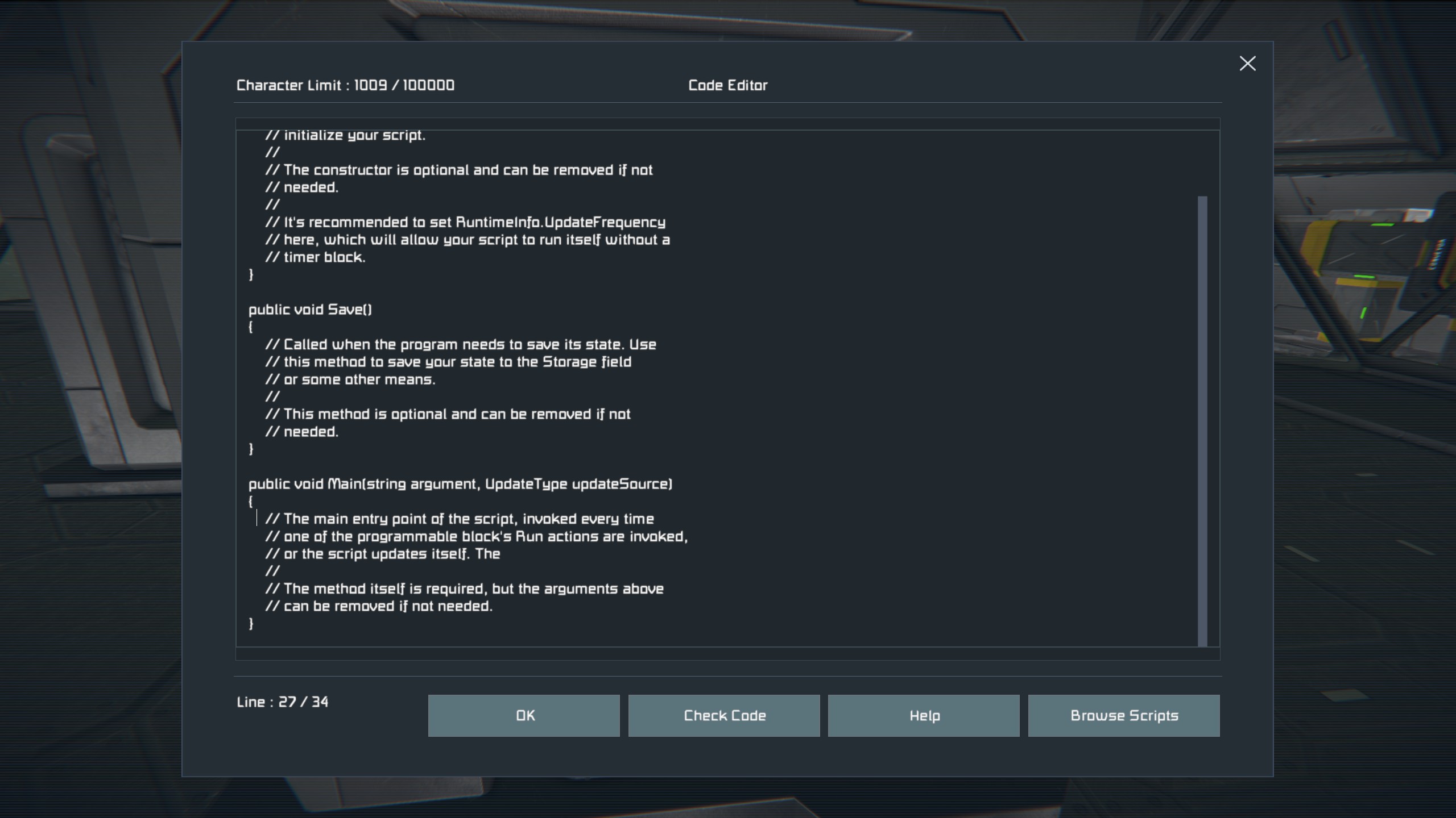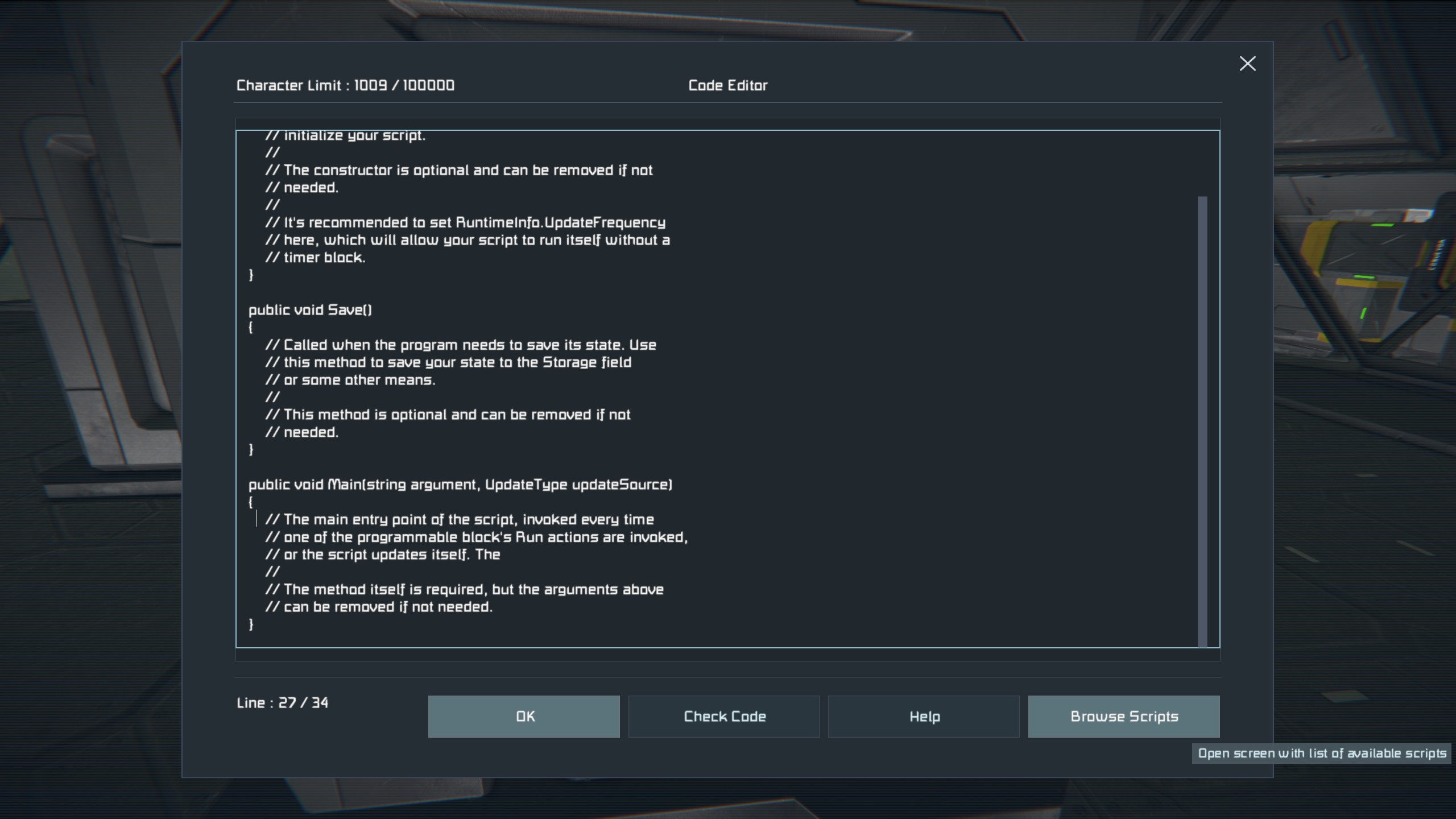 Go to programmable block. Press K on screen. Open editor. Try pasting script from library, leaving e t c. Even ESC key gets ignored, but code edition works.